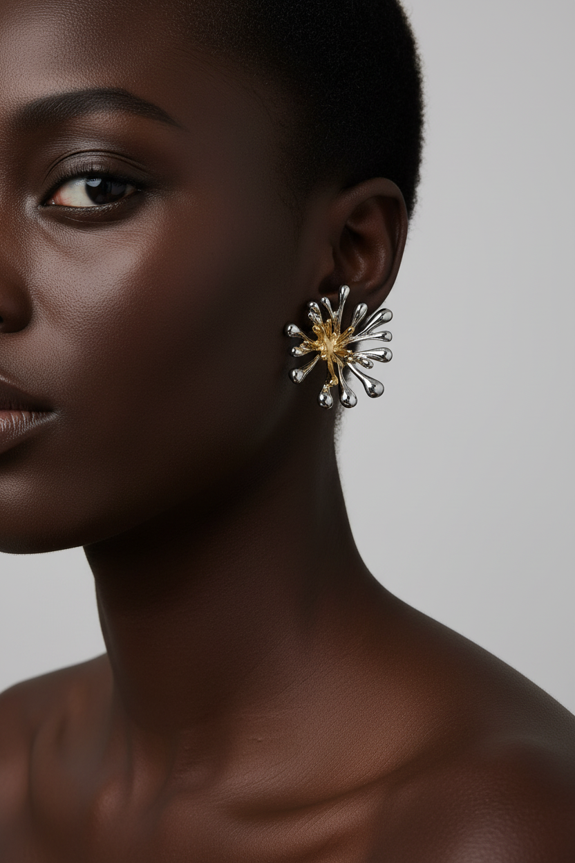 Baraka earrings resemble a burst of joy, like fireworks or blooming petals. They are a bold accessory for festive occasions and unforgettable moments.