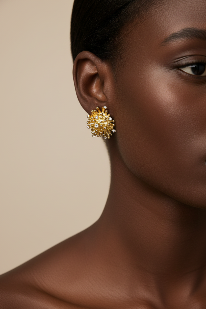 Jamila earrings sparkle with clustered golden crystals, offering graceful radiance for timeless elegance.