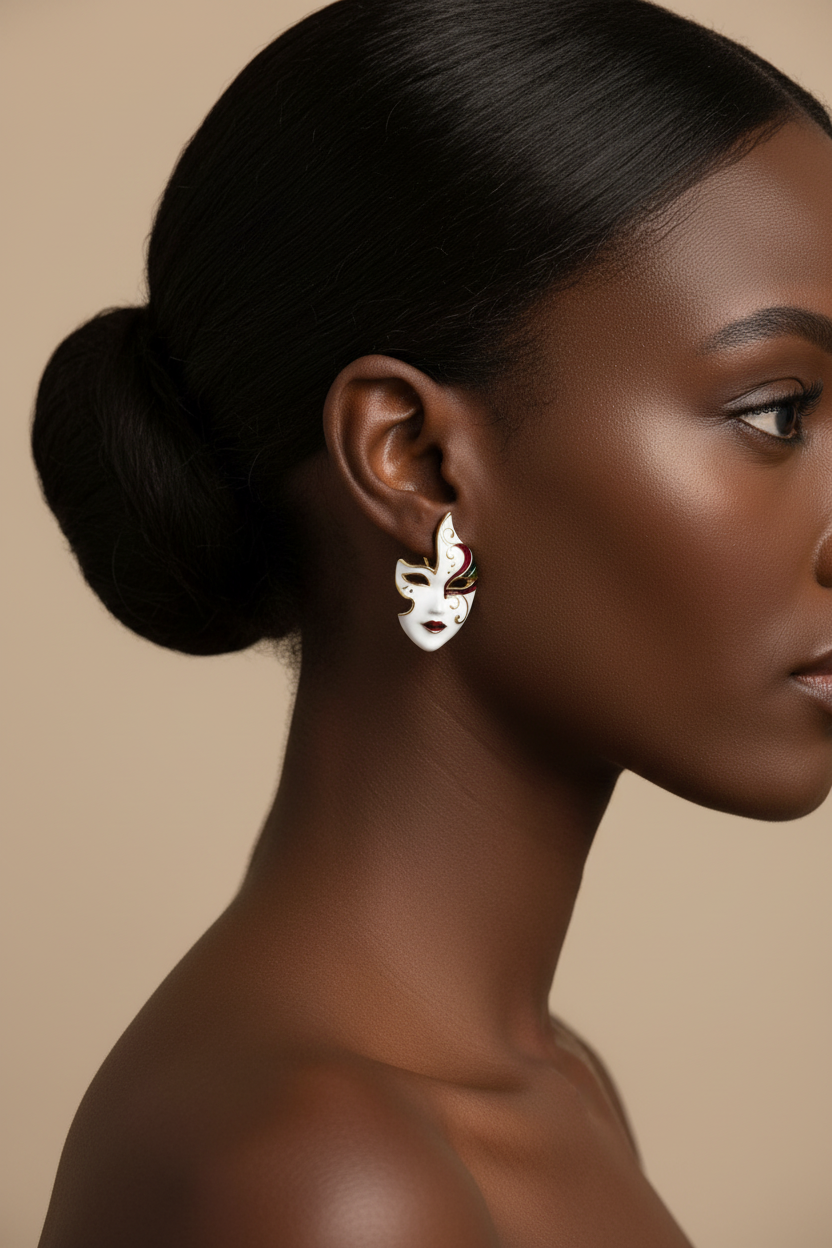 Sanaa earrings bring wearable art to life with face-mask designs and cultural patterns. Creative, bold, and playful.