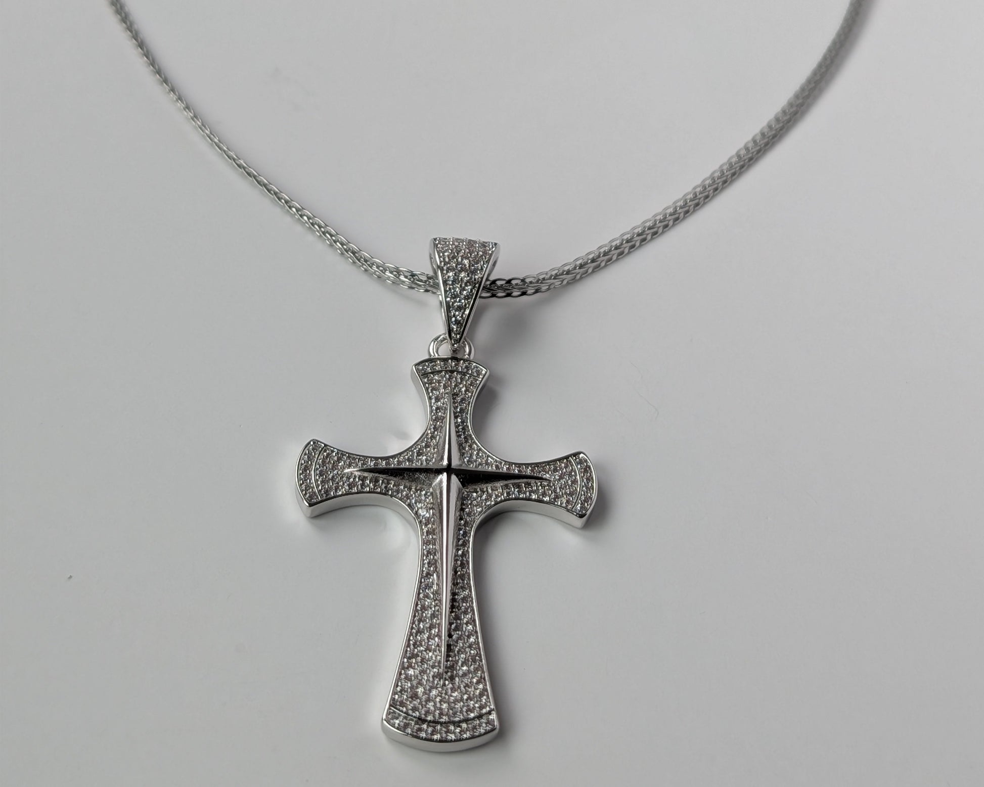 The detailed silver cross pendant is delicately framed with pave stones, making it a classic for both spiritual expression and everyday grace.
